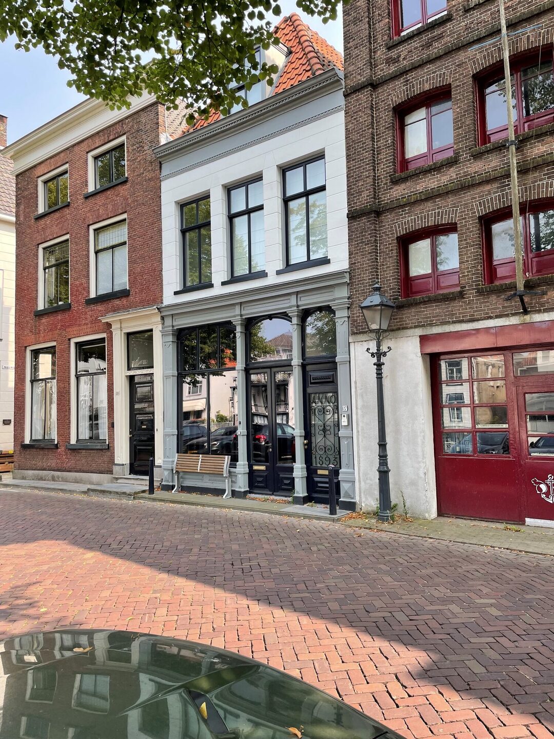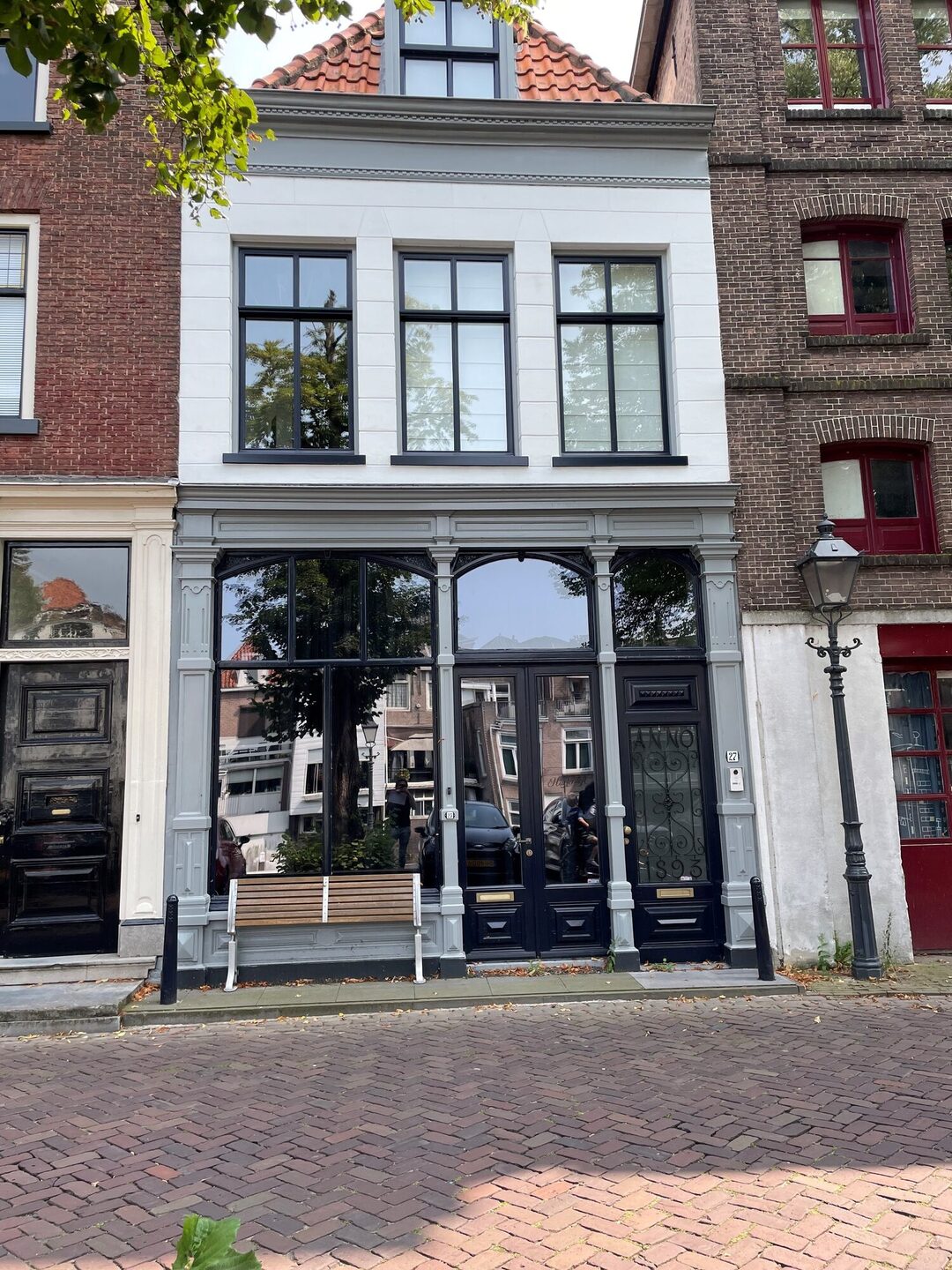 Winnaar van de StadsherstelprijsDeze woning heeft een fraaie gevel met mooie zuilvormige ornamenten. De ruimte tussen de zuilen is telkens verschillend en vormen evengoed een rustig gevelbeeld. De diepblauwe kleur van de ramen, deuren en kozijnen vormen een mooi contrast met de grijze tinten van de zuilen en de witte gestucte gevel. Samen met de fraai gedecoreerde gootlijst zorgt dit voor een harmonisch gevelaanzicht.