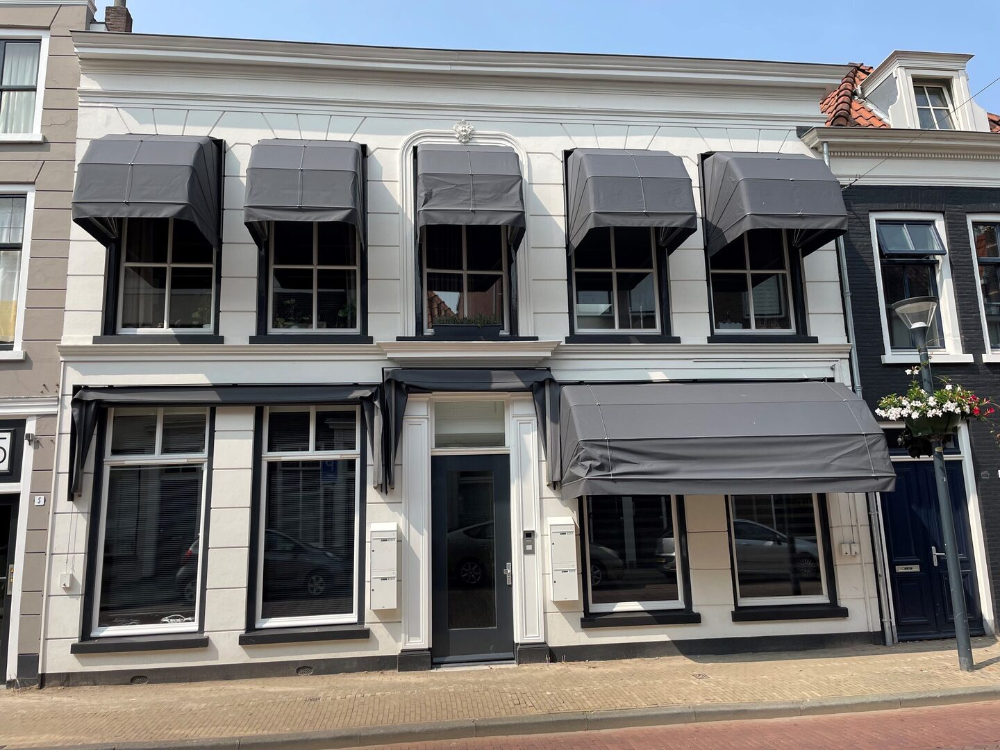 Dit voormalige winkelpand is getransformeerd tot meerdere appartementen. De symmetrische gevel heeft een eigen karakter met op de begane grond laag doorlopende kozijnen. Ter plaatse van de centrale entree vallen de gestucte ornamenten op. Boven de entreedeur is een uitkraging,die de toegang tot de appartementen accentueert. De gestucte gevel is licht van kleur. De donkere buitenkozijnen zorgen, samen met de donker gekleurde markiezen,voor een eigen karakter.